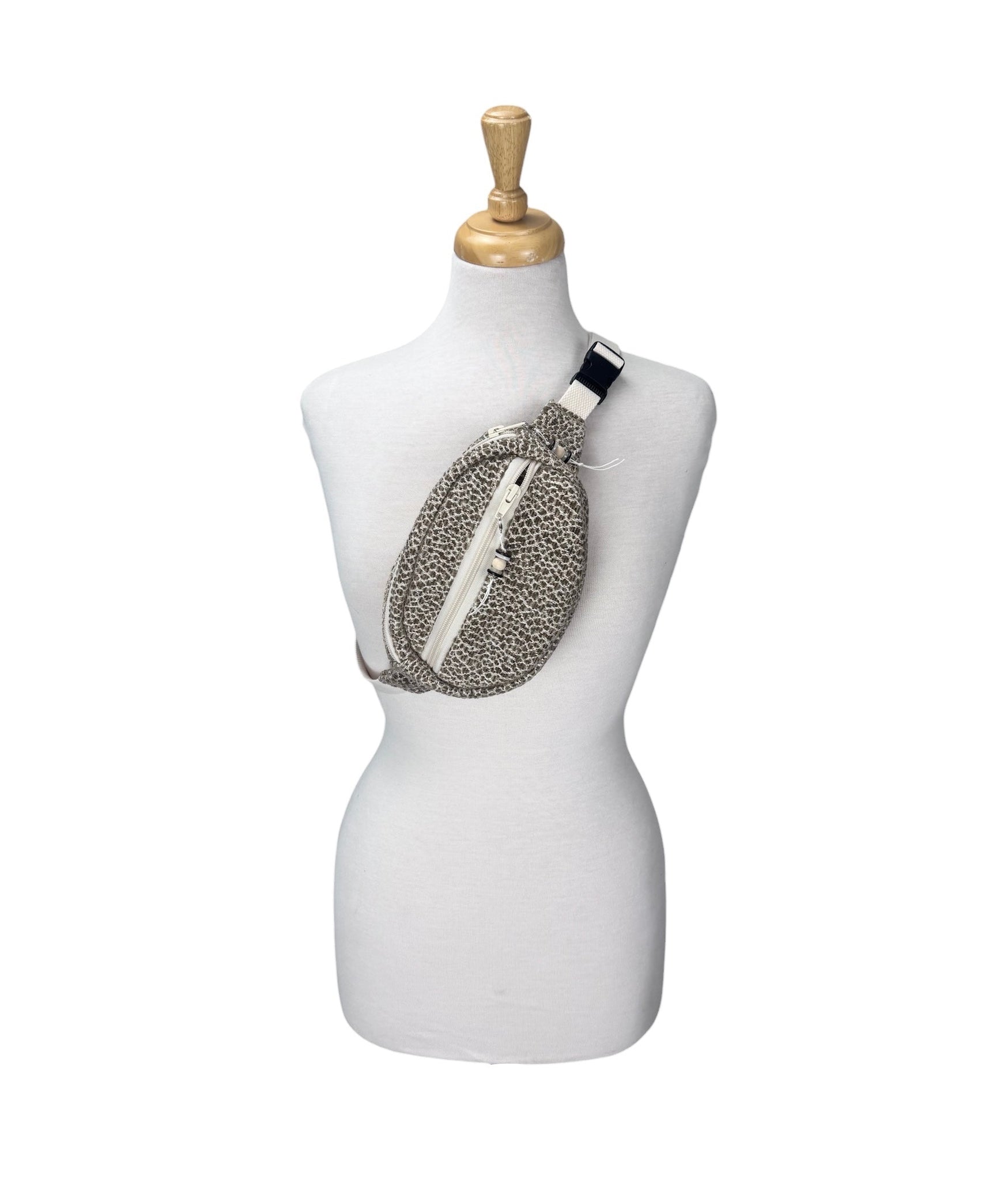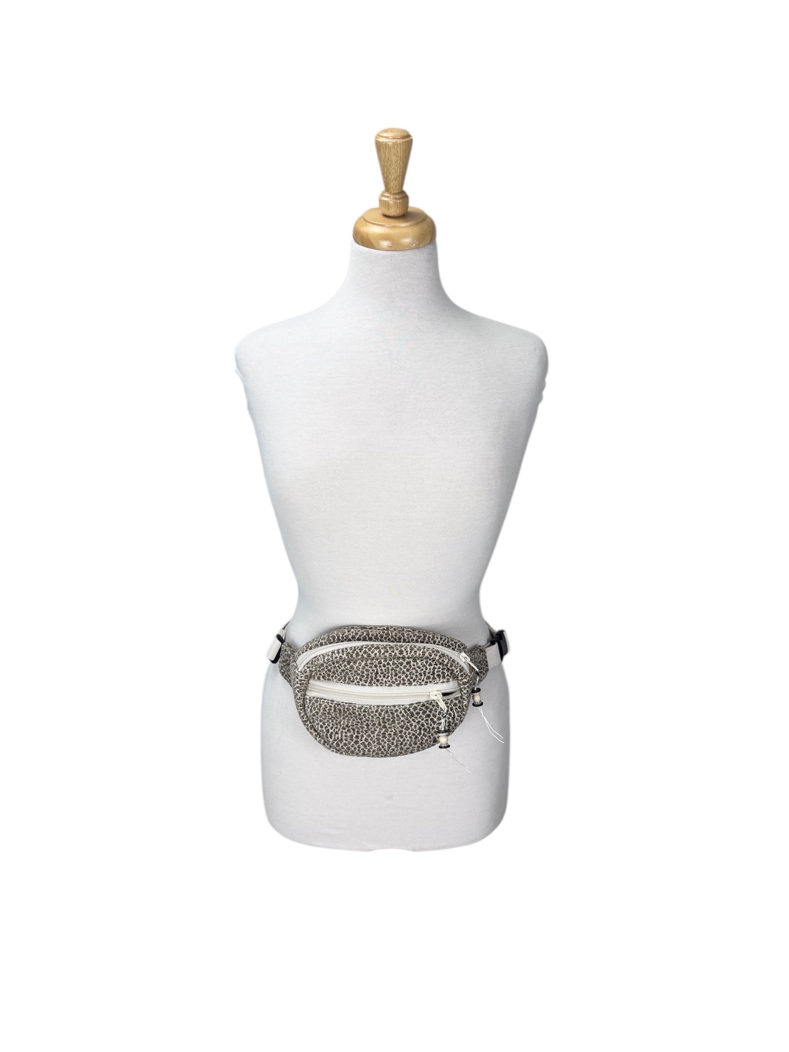 The body of this bag has a khaki base and looks somewhat like a small giraffe print. The strap and zipper ate both cream.