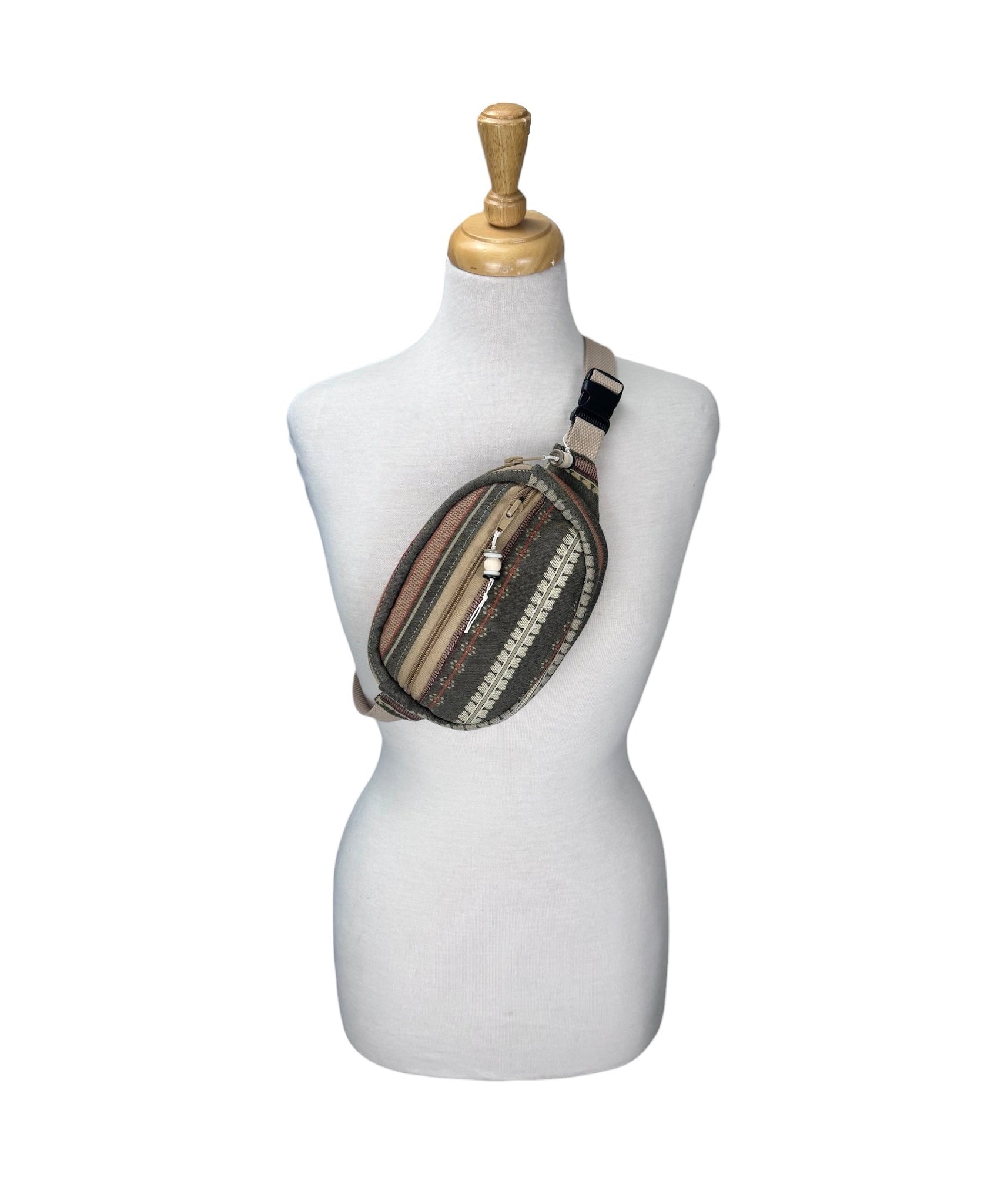 Our Frannie Pack (AKA Fannie Pack, Bum Bag or Festival Bag) is the perfect little bag to accompany you on all kinds of adventures where you need to stay hands-free and unemcumbered. It's big enough (8"x 5"x 2.5") to hold the necessities like a phone, cash, glasses and lipstick without being bulky. It can be worn around your hips or across your shoulder. It features a zipper closure on top and has an outer zip pocket and is fully lined. At its smallest, the cotton webbing belt is approximately 22" long and its longest length is approximately 37". It has a plastic quick-release buckle and the zipper pulls feature a unique collection of buttons and beads that have been added by hand.