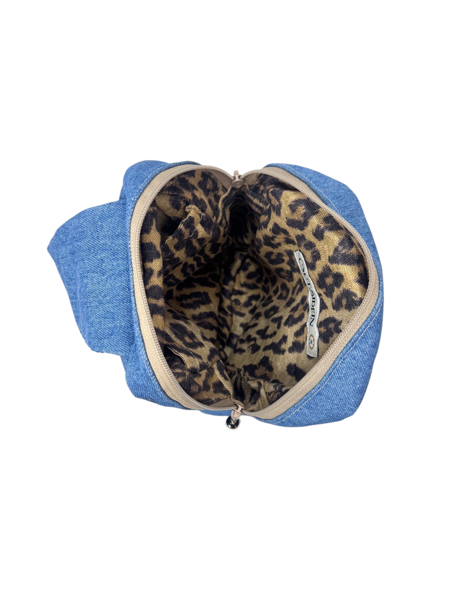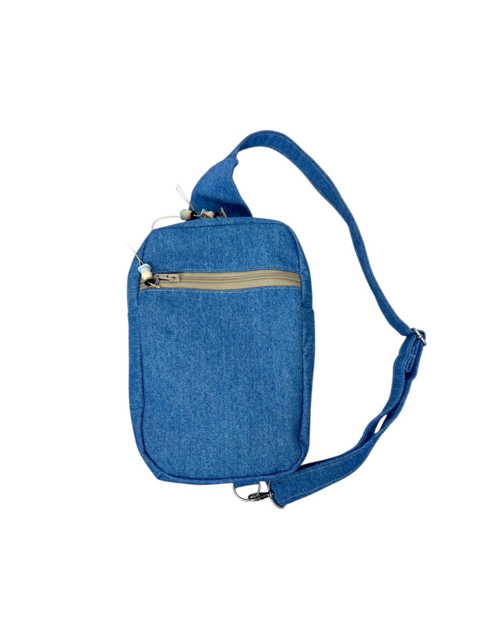 This FreedUP Sling Bag is a medium wash denim fabric with a tan zipper.